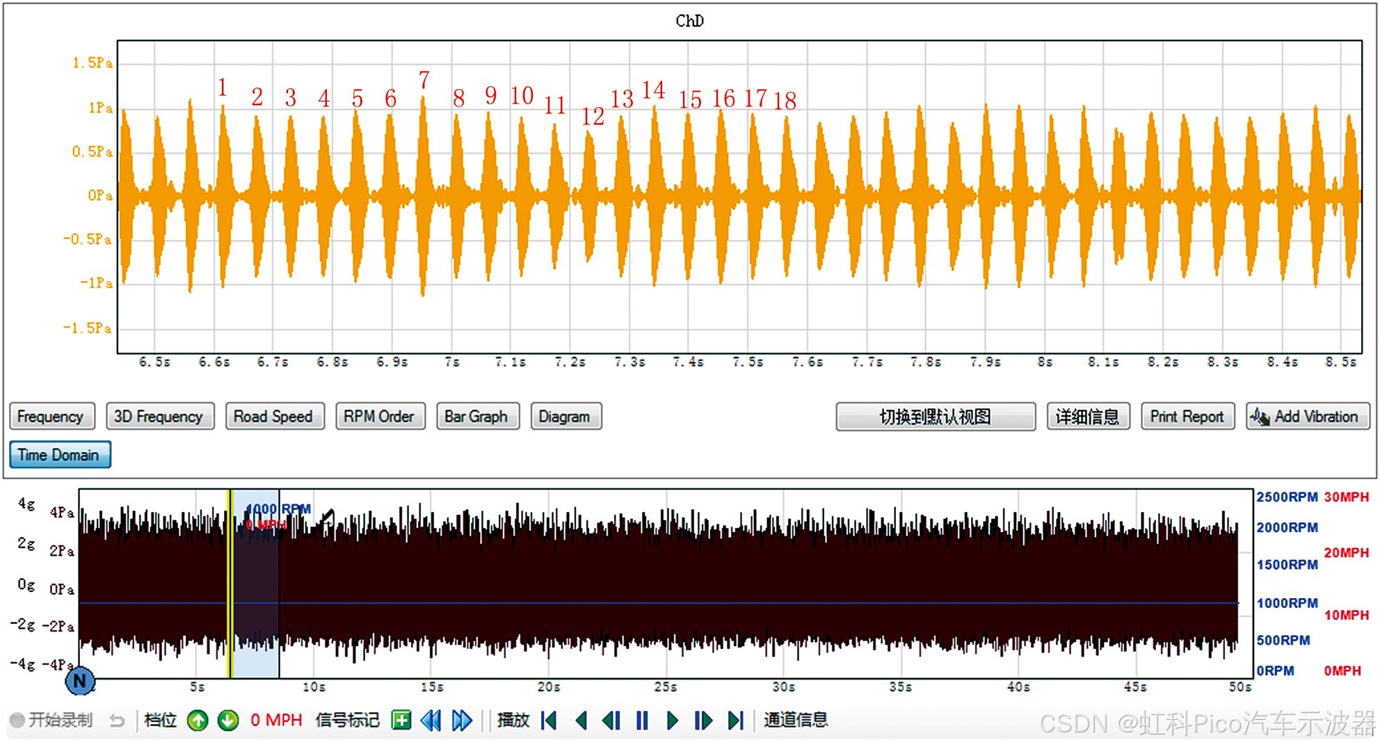 使用虹科Pico汽车示波器+NVH套装采集故障出现时发动机室的噪音信号和发动机上的振动信号(图1),用频域分析可知,发动机上的振动主要是发动机二阶振动(E2)及其谐振,这在4缸发动机上是正常的。