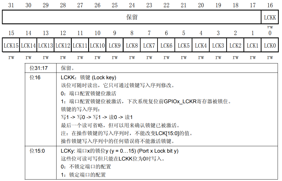 七、端口配置锁定寄存器(GPIOx_LCKR)(Port configuration LOCK Register)