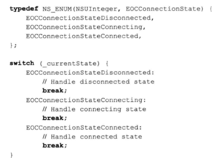 我们习惯在switch语句中加上default分支。然而,若是用枚举来定义状态机,则最好不要有default分支。这样的话,如果稍后又加了一个状态,那么编译器就会发出警告信息,提示新加入的状态并未在switch分支中处理。假如写上了default分支,它就会处理这个新状态,从而导致编译器不发出警告信息。