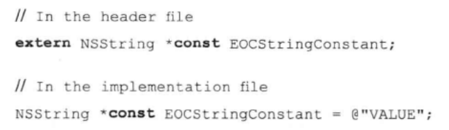 这个常量在头文件中"声明",且在实现文件中"定义"。注意const修饰符在常量类型中的位置。常量定义应从右至左解读,所以在本例中,EOCStringConstant就是"一个常量,而这个常量是指针,指向NSString对象"。这与需求相符:我们不希望有人改变此指针常量,使其指向另一个NSString对象。