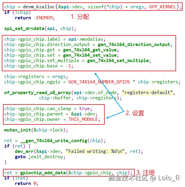 分配、设置、注册gpioc_chip结构体,示例:drivers\gpio\gpio-74x164.c