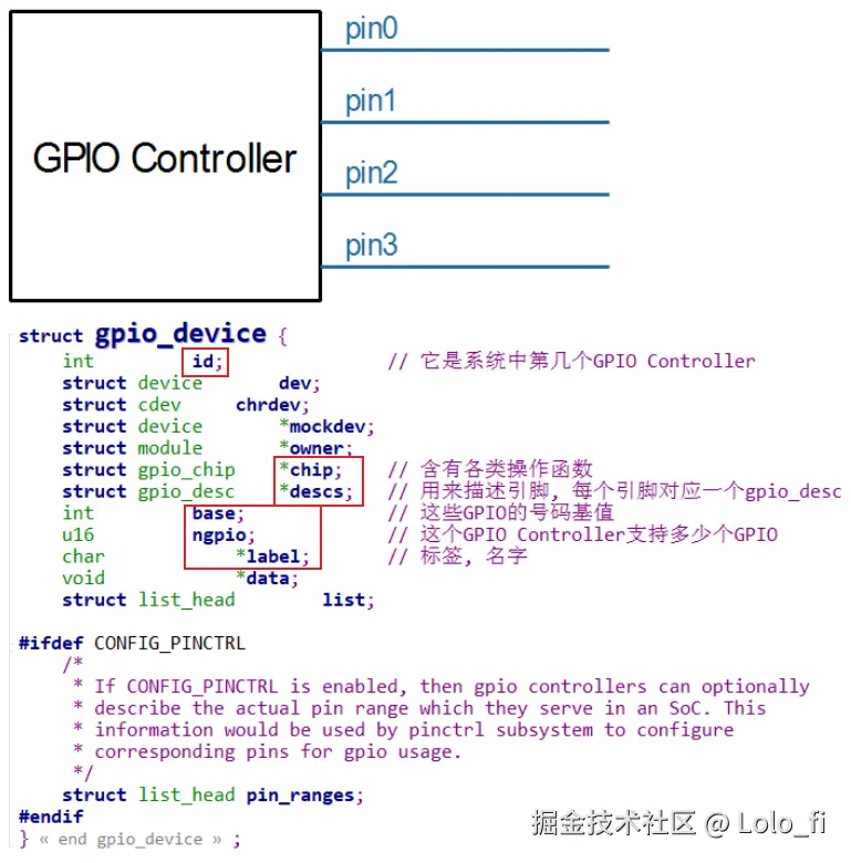 三者共同构成了 Linux GPIO 子系统的核心,用于管理 GPIO 设备和引脚。