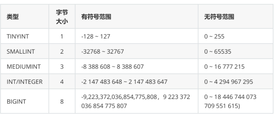创建表时,需要指定各个字段的类型,常见类型如下: