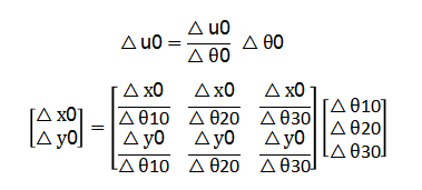 那UCM空间是如何计算出来的呢?以图6中例子作为说明,l1、l2、l3分别为上臂长、前臂长和手长,θ1、θ2、θ3为对应的3个关节角度,x和y为手指末端的位置,它们之间的关系可以表示为式3。把u=[x,y]设为位置向量,把θ=[θ1、θ2、θ3]设为关节角度向量。x0和y0为目标位置,当手指到达目标位置时,位置向量为u0=[x0,y0],关节向量为θ0=[θ10、θ20、θ30](由于冗余性,θ0可以有多个值,u0是确定值,只有一个)。