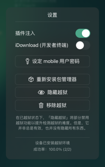 如果想要清除越狱状态,打开 Dopamine 工具,点击设置-移除越狱,根据提示进行操作,即可有效清除越狱环境。