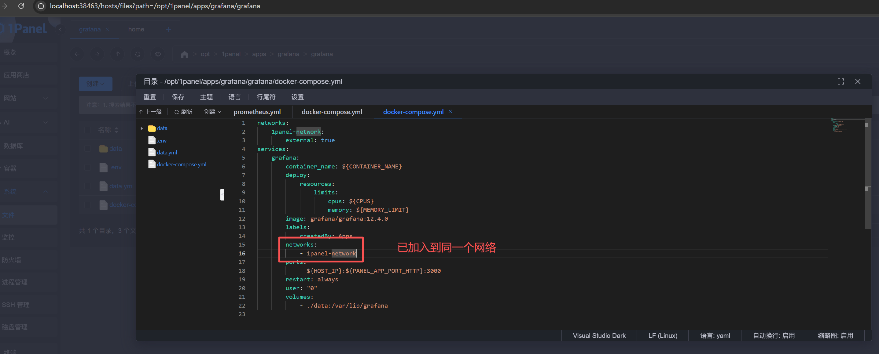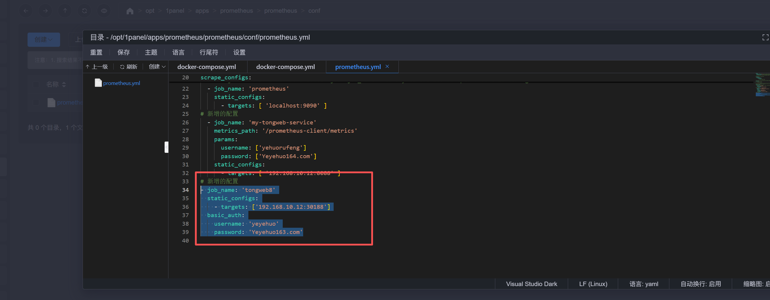 找到prometheus.yml进行粘贴和修改(注意位置和缩进,改之前最好备份):
