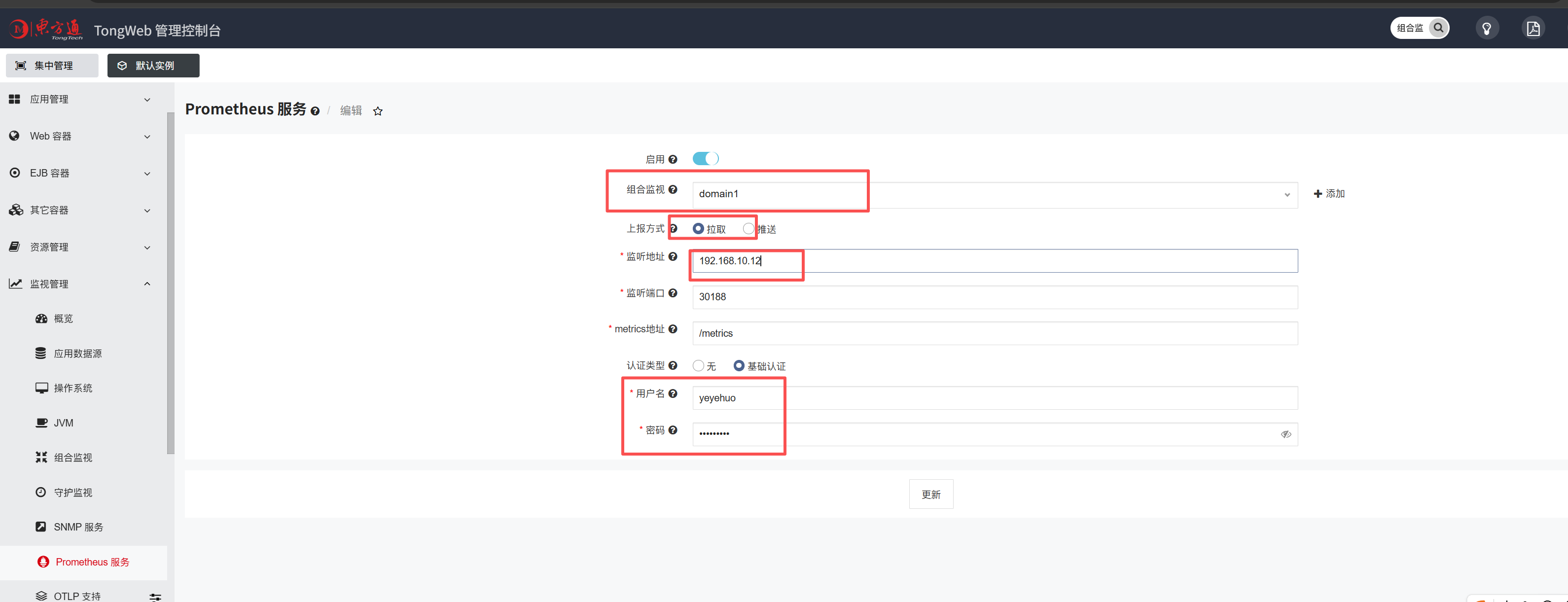 选择之前创建好的组合监视,选择上报方式为拉取,填写服务器本机ip,使用的端口号(可以用默认的),配好认证信息,点更新。
