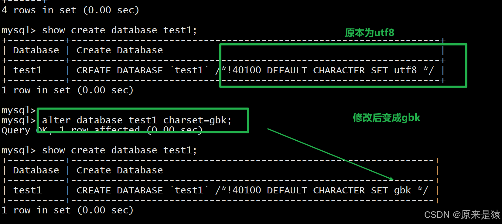 alter database test1 charset=gbk;