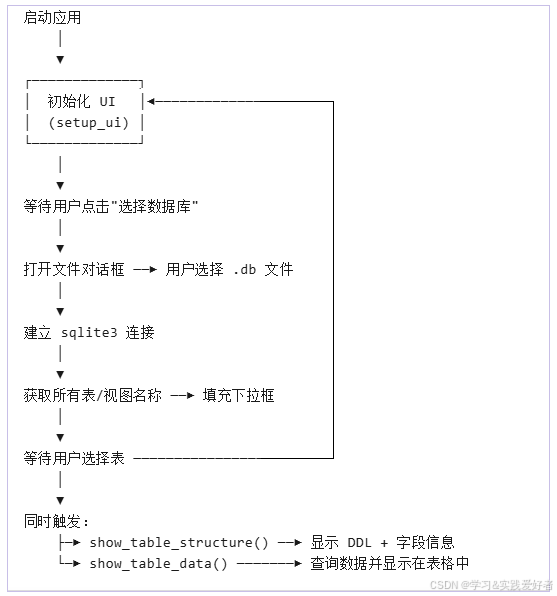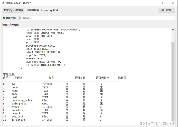 一个基于 Python tkinter 开发的桌面 GUI 应用程序,特别适合需要快速查看 SQLite 数据库内容的场景------用于可视化查看 SQLite 数据库的结构和数据,并能将表数据导出为CSV文件。