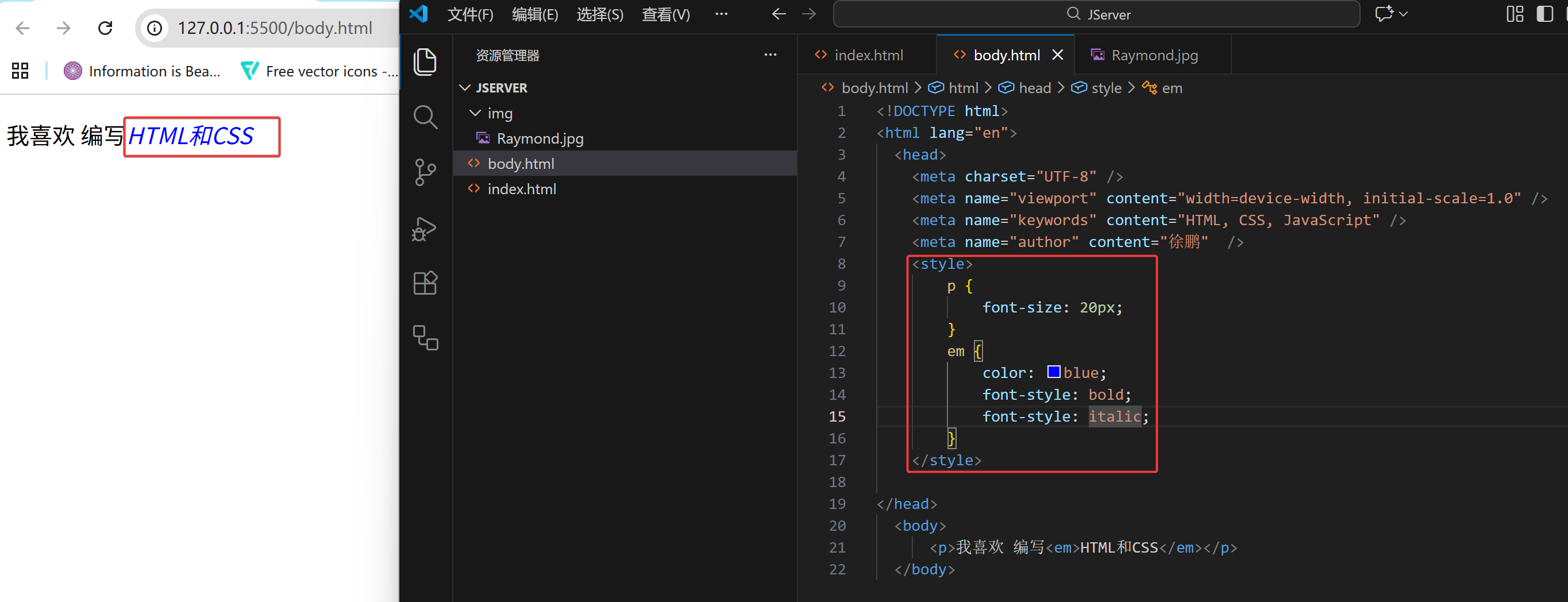 当然我们可以在这里给em标签定义特别的风格,例如在这里我们希望它的颜色是红色,然后粗体,可以依照下面的内容进行定义。