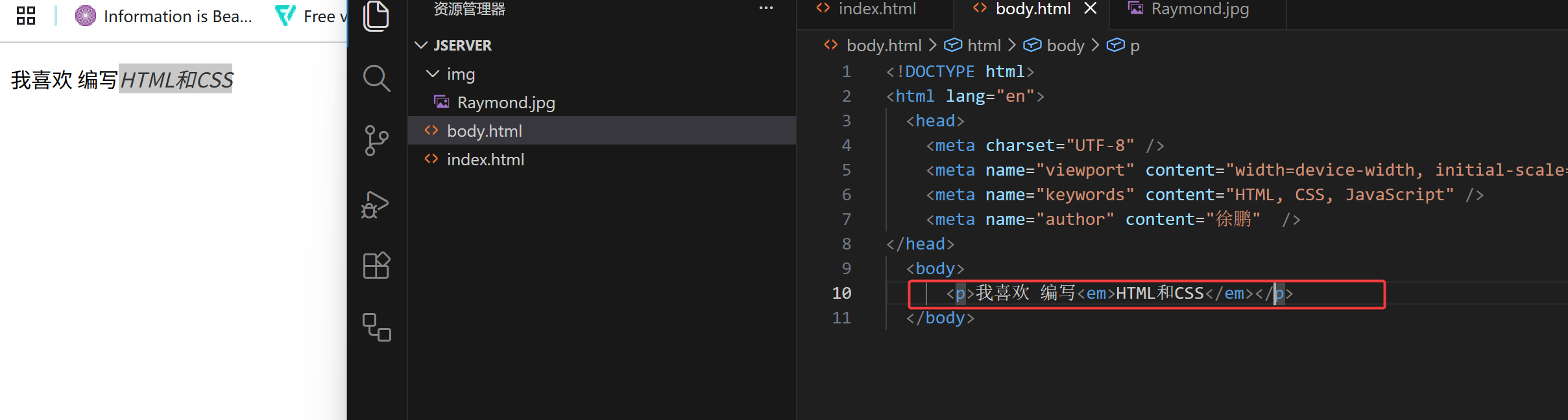 在这里如果我们希望强调特别的文字,可以使用<em> 进行内容强调,默认强调情况下