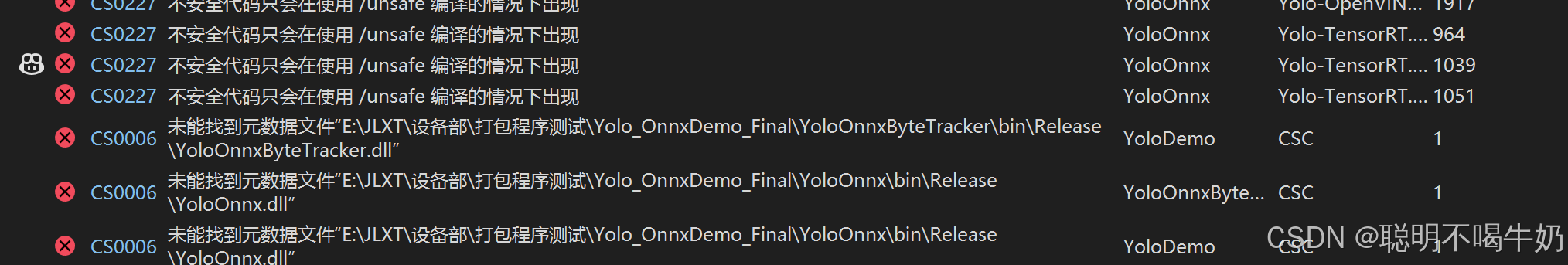 CS0227: 不安全代码只会在使用 /unsafe 编译的情况下出现(源自底层的 YOLO/ONNX 封装类库)CS0006: 未能找到元数据文件"xxx\YoloOnnx.dll"(源自依赖该类库的主程序)