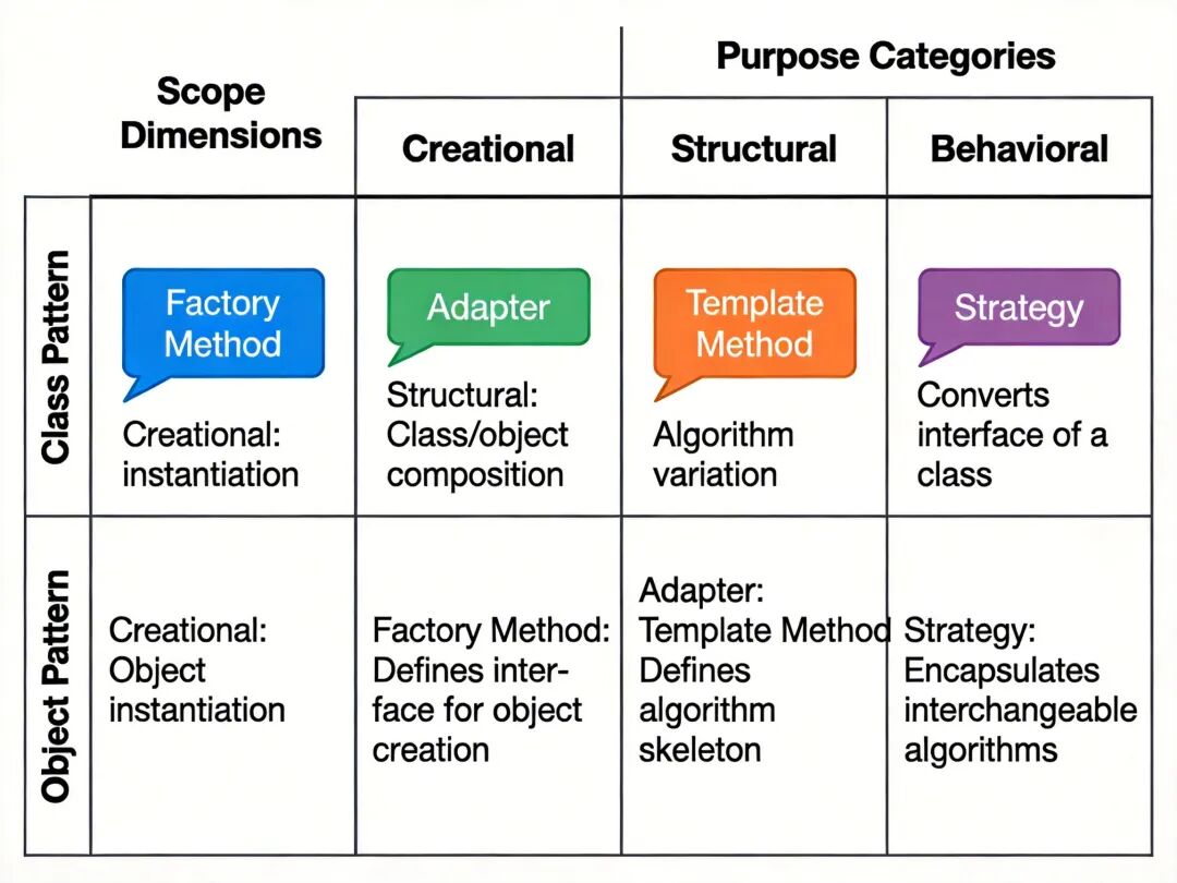 设计模式的分类维度有两个:一是目的维度,即模式用于解决什么问题,分为创建型、结构型、行为型三类;二是范围维度,即模式是处理类之间的关系还是对象之间的关系,分为类模式和对象模式两类,其中类模式基于继承关系实现,对象模式基于组合 / 关联关系实现。