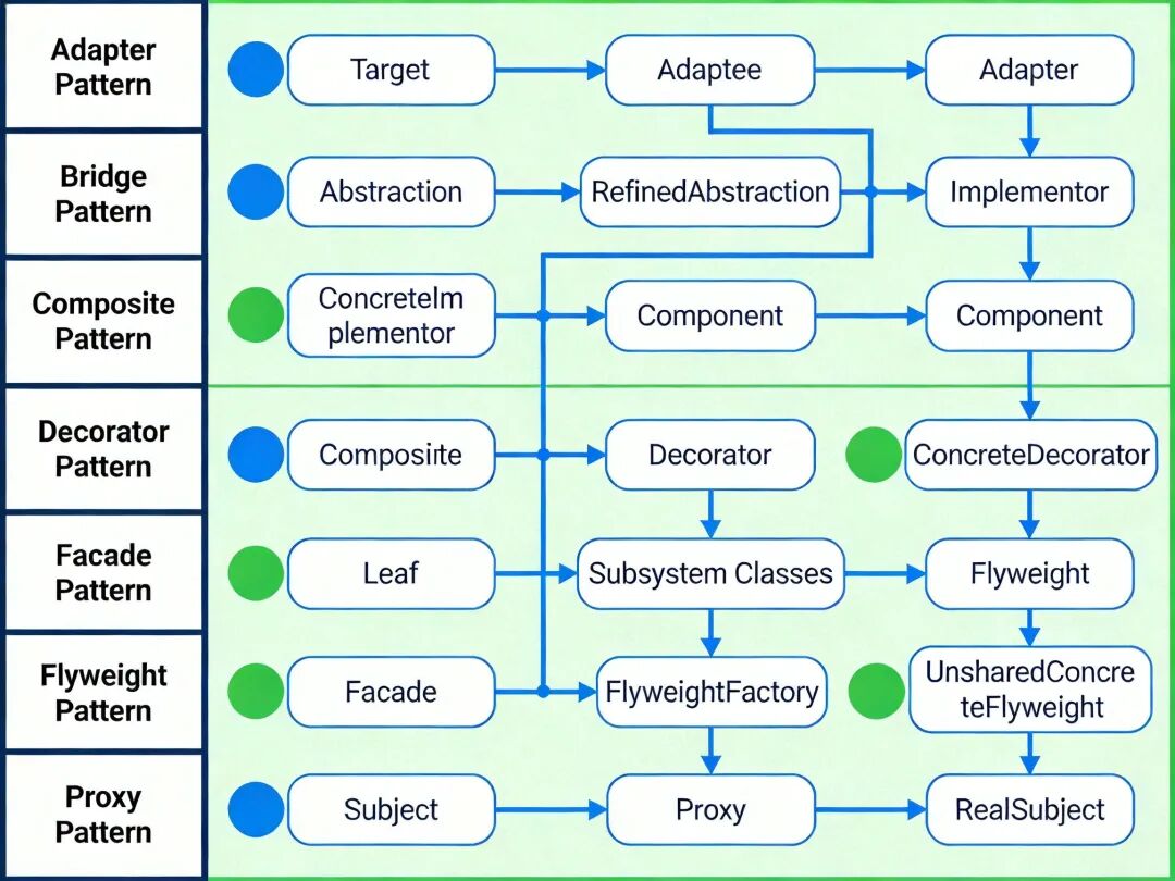 7 种结构型模式分类与角色关系示意图,左侧标注模式名称,右侧展示每种模式的核心角色交互关系,区分类模式与对象模式。