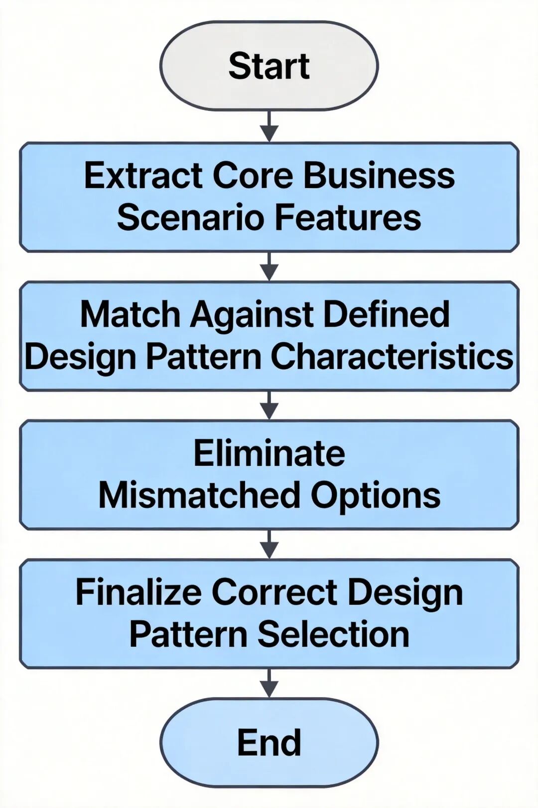 设计模式答题逻辑流程图,展示从场景提取特征到模式匹配的判断步骤。