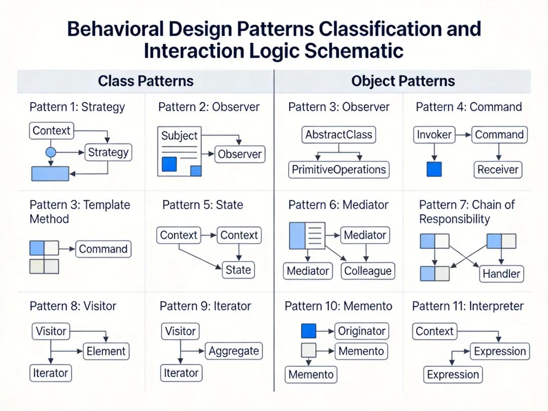 11 种行为型模式分类与交互逻辑示意图,区分类模式与对象模式,展示每种模式的核心交互流程。