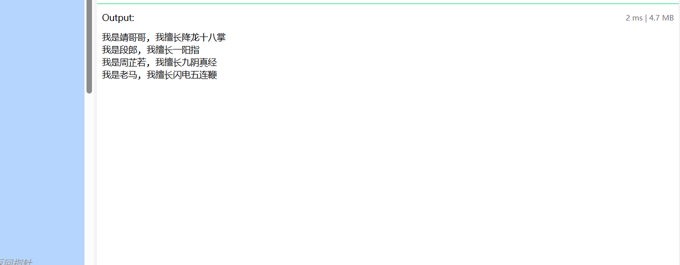 fmt.Printf("我是%s, 我擅长%s\n", zhouzhiruo.nickName, zhouzhiruo.wugong)