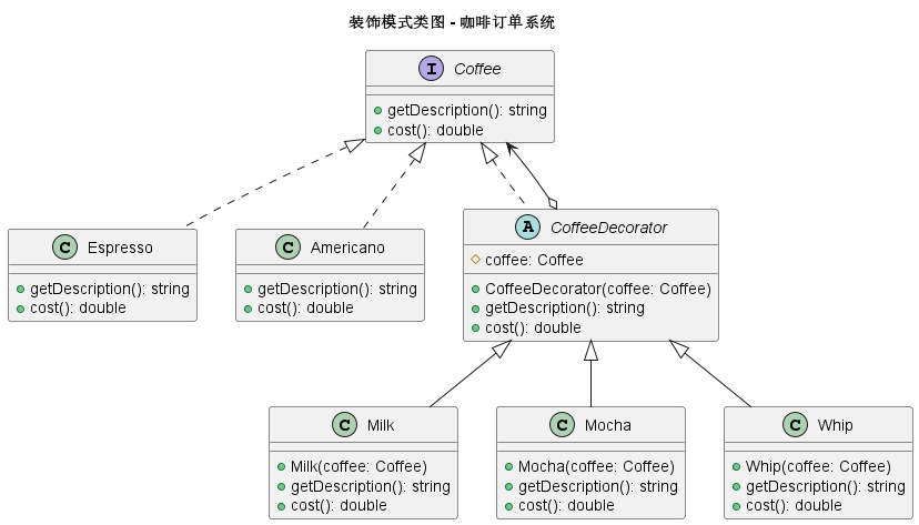 以咖啡订单系统为例,假设我们需要计算不同咖啡饮品的价格和描述: