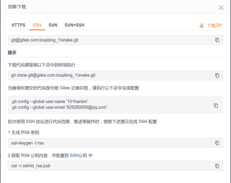 这里的SSH地址和HTTPS地址的区别,在于HTTPS地址需要每次输入账号密码
