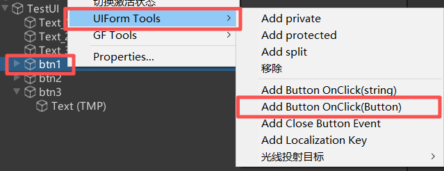 对按钮右键选择UIFromTools,然后选择AddButtonOnClick添加按钮回调事件