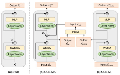 本研究提出的CIA-Net模仿了放射科医生的诊断工作流程,明确区分了一个主模态(T2加权成像)和多个次模态,以充分利用辅助序列的信息,同时避免噪声影响。CIA-Net的整体框架基于U-Net概念,包含混合Transformer编码器(执行选择性跨模态特征编码)和卷积解码器(通过跳跃连接中PNIM模块的辅助进行分层特征重建)。网络为每个模态使用独立的编码器路径,以保留其独特的特征分布。主要组件包括:跨模态协作模块(CCB)用于建立从次模态到主模态的交互路径;渐进式上下文注入模块(PCIM)集成在CCB中,负责选择性聚合互补特征并抑制噪声;渐进式邻域集成模块(PNIM)部署在跳跃连接中,通过整合切片间上下文来优化特征。输入图像首先通过嵌入层提取初始特征。随后,这些特征输入到四阶段Transformer编码器,每个阶段包含一个移位窗口块(SWB)和本文提出的CCB,CCB内部利用PCIM进行选择性信息融合。在CCB中,SWB独立处理每个模态的特征图以获得模态内上下文特征。然后通过PCIM将次模态信息选择性地融合到主模态中,CCB-MA处理主模态特征,CCB-MI提取次模态信息,实现单向特征传输。PCIM采用级联聚合过程,通过上下文注入模块(CIM)将次模态上下文渐进且选择性地注入主模态。CIM通过三个并行分支(主融合、注意力图和残差连接)运作,利用注意力图进行空间选择,并保留主模态特征的完整性。最后,编码器的多尺度特征图通过跳跃连接馈入四阶段解码器。PNIM被整合在这些跳跃连接中,通过建模切片间依赖性来增强特征表示,模仿放射科医生检查相邻切片以理解3D解剖上下文的过程,有助于处理肿瘤的切片间变异。PNIM采用渐进式结构,包含级联的邻域集成模块(NIM),每个NIM利用专门的邻域注意力机制,通过通道混洗和1D卷积学习切片间和模态间关系,最终通过残差块整合并校准相邻切片的有用信息。