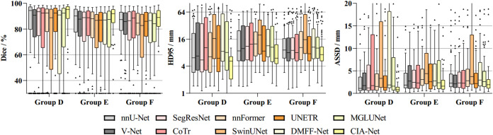 图8.不同网络用于卵巢肿瘤分割的组别比较。组D:良性卵巢肿瘤。组E:交界性卵巢肿瘤。组F:恶性卵巢肿瘤。