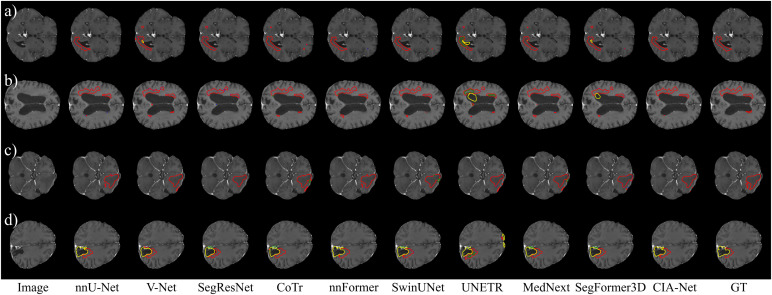 图11. BraTS 2024数据集上的分割结果定性比较。我们的方法与其他主要方法在代表性病例上进行比较,展示了其在描绘肿瘤亚区域方面的有效性。图像中,红色轮廓描绘增强肿瘤,黄色轮廓描绘切除腔。