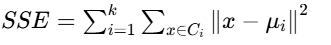 KMeans 算法的优化目标,是最小化所有数据点到其所属聚类中心的平方误差和(SSE),对应的数学公式如下: