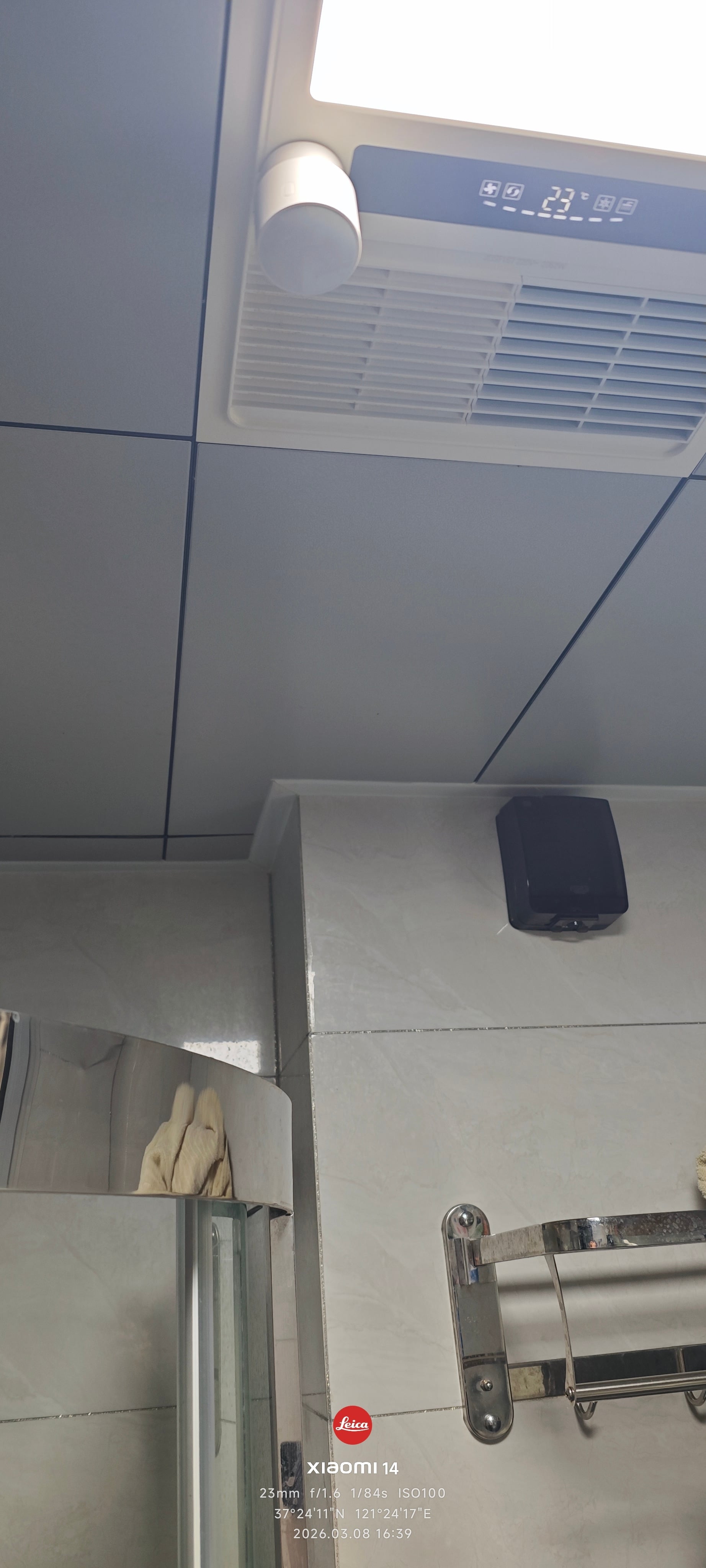 我的方案是直接把它粘在浴霸主机侧面,朝下照射。这个位置居高临下,能同时覆盖淋浴区、马桶和洗手台,几乎没有死角。