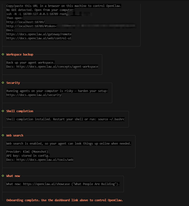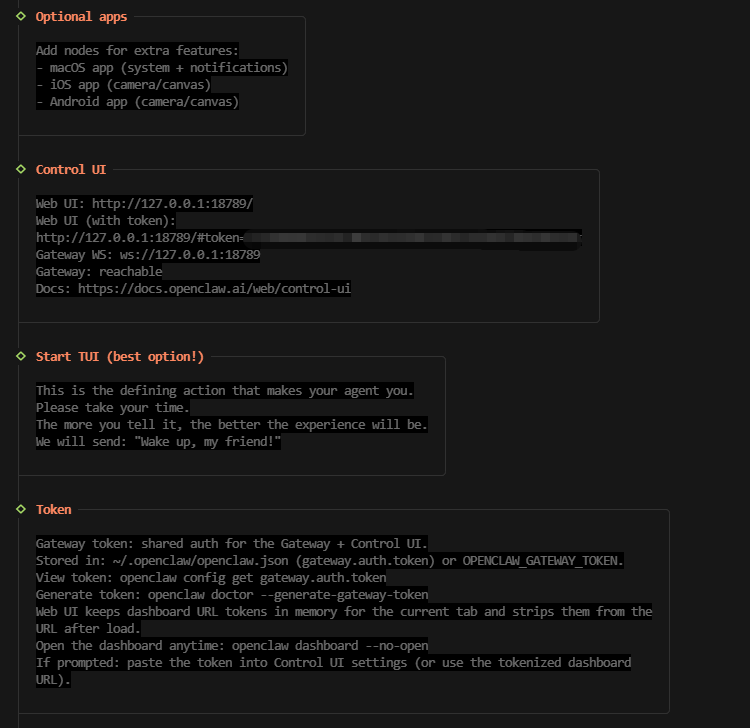这是 OpenClaw 完成全部初始化后的最终就绪界面,核心信息如下: