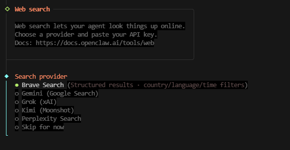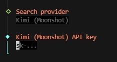 Web 搜索 :已启用,提供商为 Kimi (Moonshot),API Key 已存储在配置中。