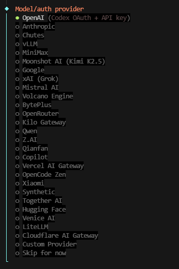 OpenAI (Codex QAUTH + API key):默认推荐选项,支持 GPT-3.5/4 等模型,需要配置 API Key。