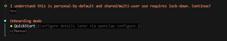 | Quickstart(快速启动) | 采用默认配置,跳过详细设置 | 个人测试、本地体验、功能验证 | 部署后通过 openclaw configure 命令补全配置 |