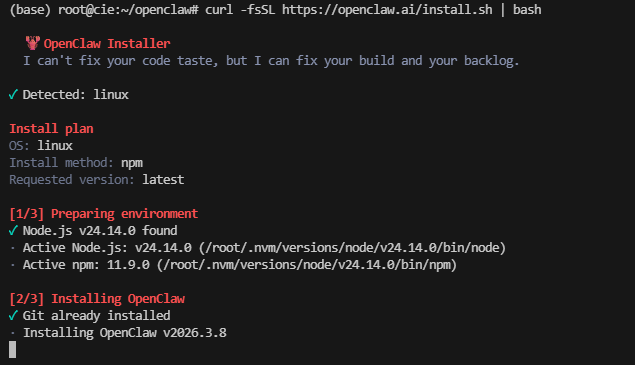 Installing OpenClaw v2026.3.8 的过程会有点久,10分钟以上;