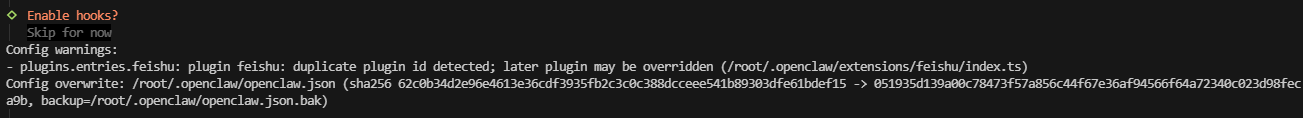 Config warnings:\n- plugins.entries.feishu: plugin feishu: duplicate plugin id detected; later plugin may be overridden