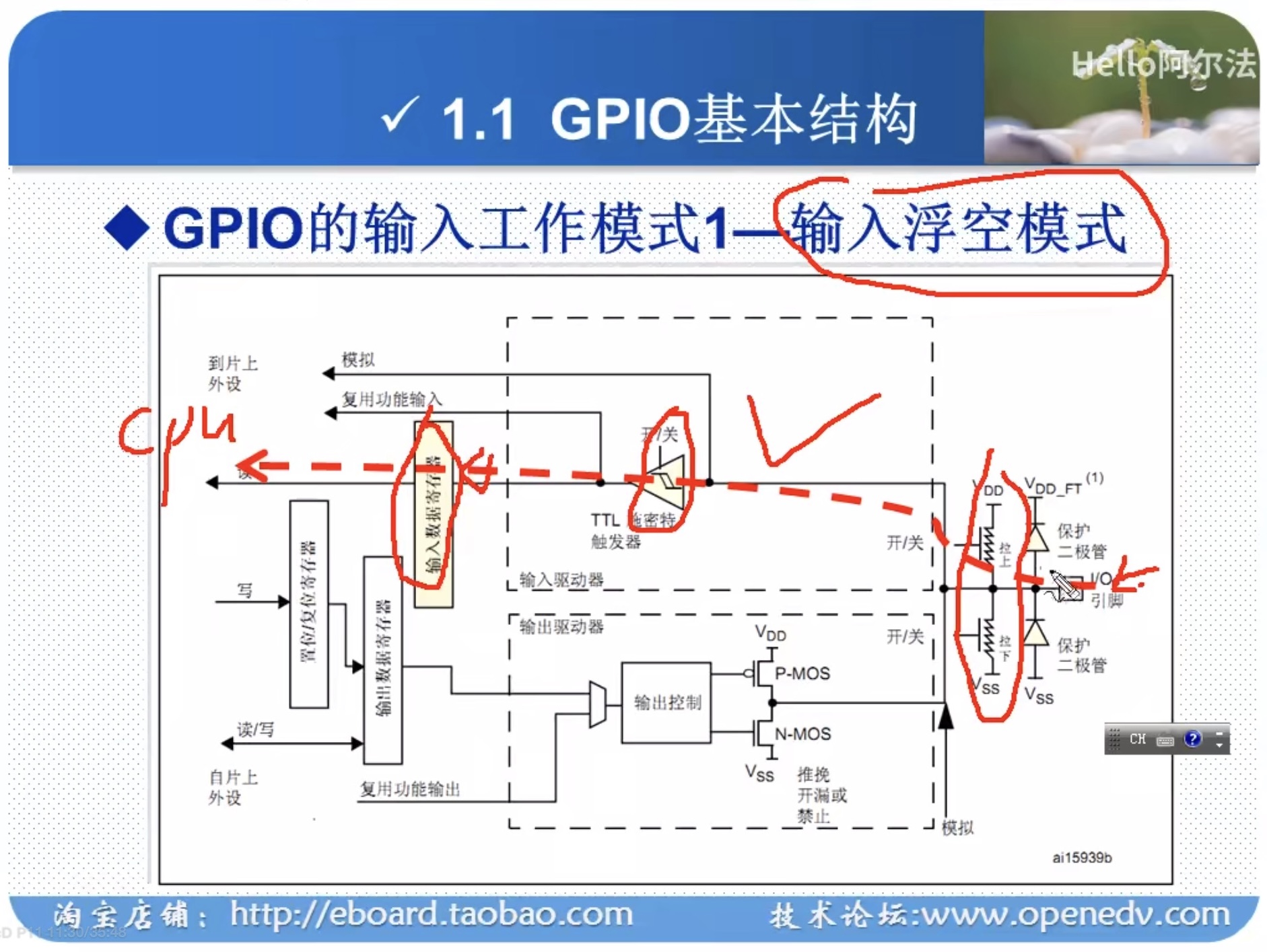浮空:只有半区起作用。具体:IO口输入➡️上拉/下拉配置➡️施密特触发器开启➡️进入输入数据寄存器➡️CPU可通过读取数据局存起获取引脚状态