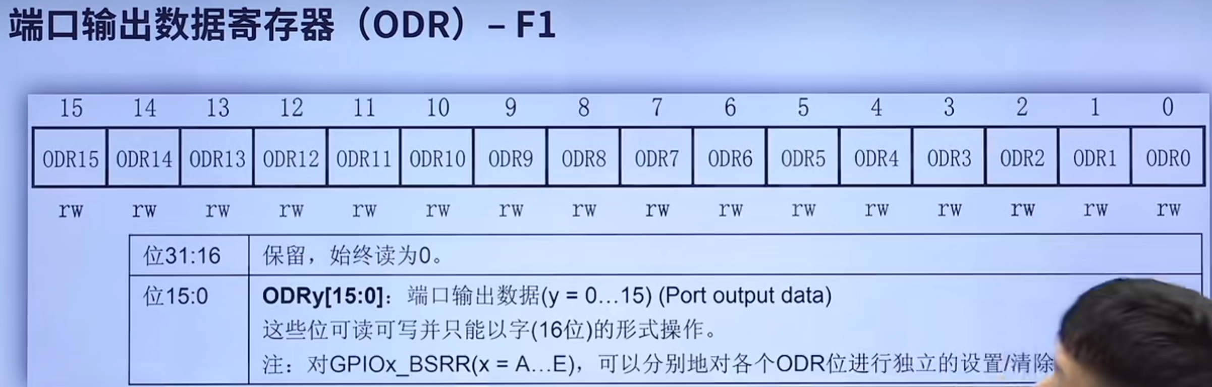 首先这是个32位的寄存器,分为两部分,作用是给ODRx 位置1或清0,前16位用于置1,后16位用于清0,注意同时设置了置1和清0时,置1的优先级更高。