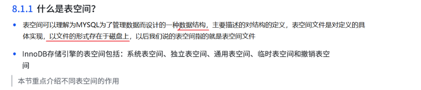 表空间可以理解为MYSQL为了管理数据⽽设计的⼀种数据结构,主要描述的对结构的定义