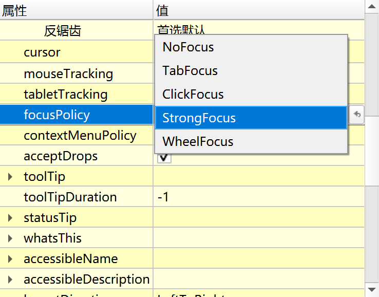 - Qt::StrongFocus :控件可以通过Tab键和鼠标点击接收焦点 (默认值)