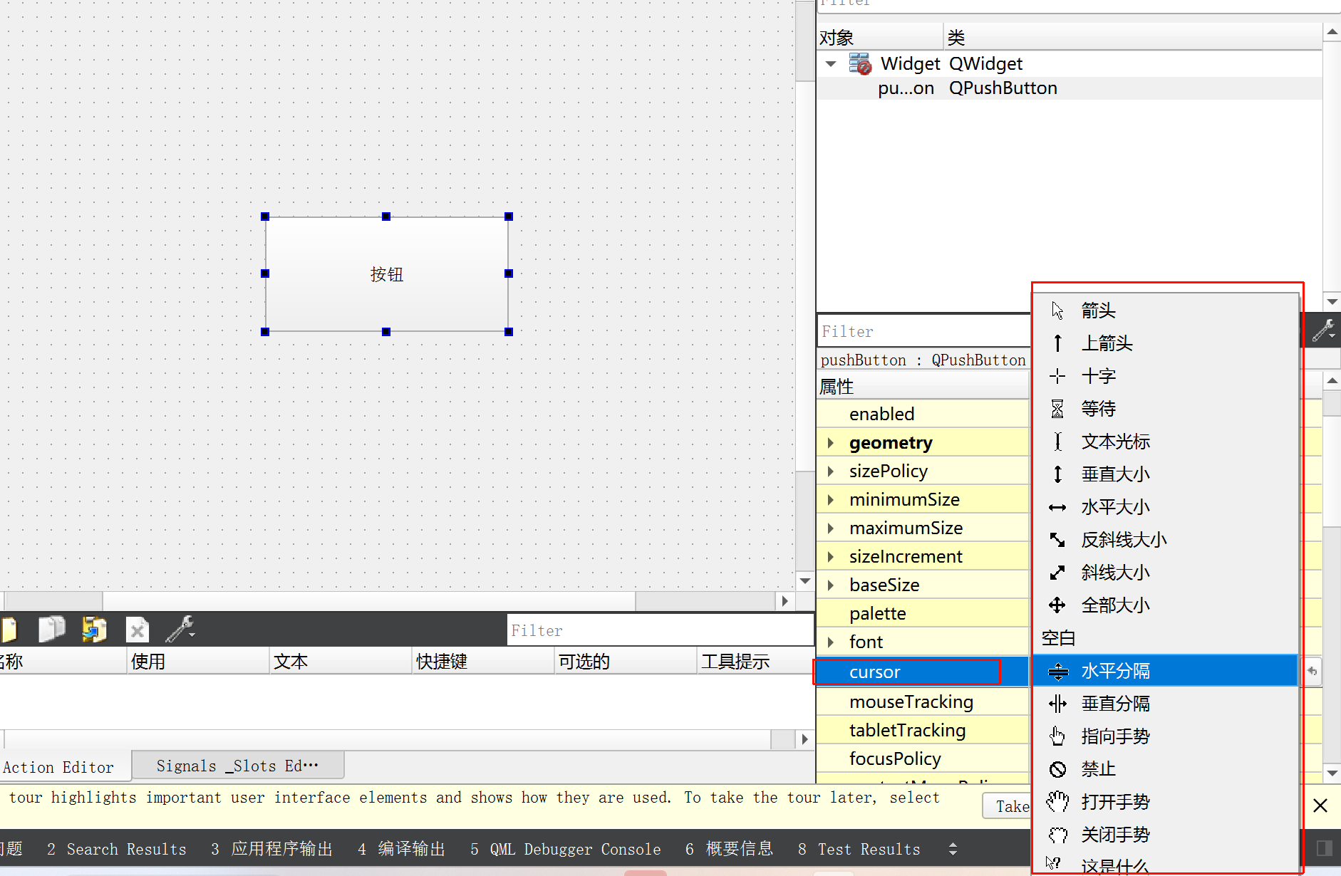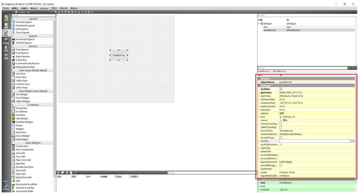 在 Qt Designer 中, 随便拖一个控件过来, 选中该控件, 即可在右下方看到 QWidget 中的属性