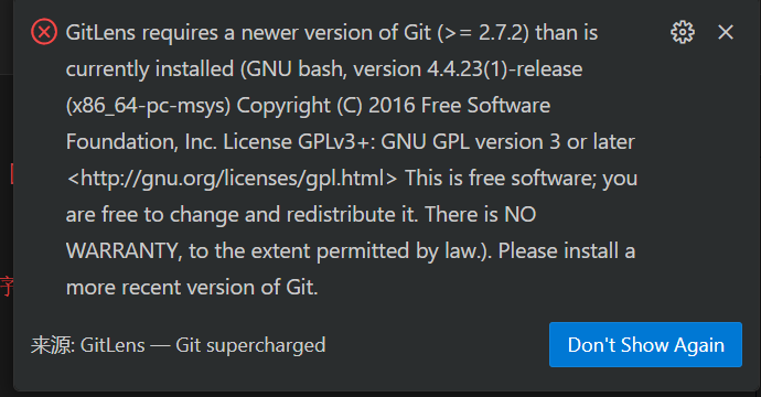 vscode报错:GitLens requires a newer version of Git (>= 2.7.2) than is currently installed (GNU bash, version 4.4.23(1)-release (x86_64-pc-msys) Copyright © 2016 Free Software Foundation, Inc. License GPLv3+: GNU GPL version 3 or later http://gnu.org/licenses/gpl.html This is free software; you are free to change and redistribute it. There is NO WARRANTY, to the extent permitted by law.). Please install a more recent version of Git.