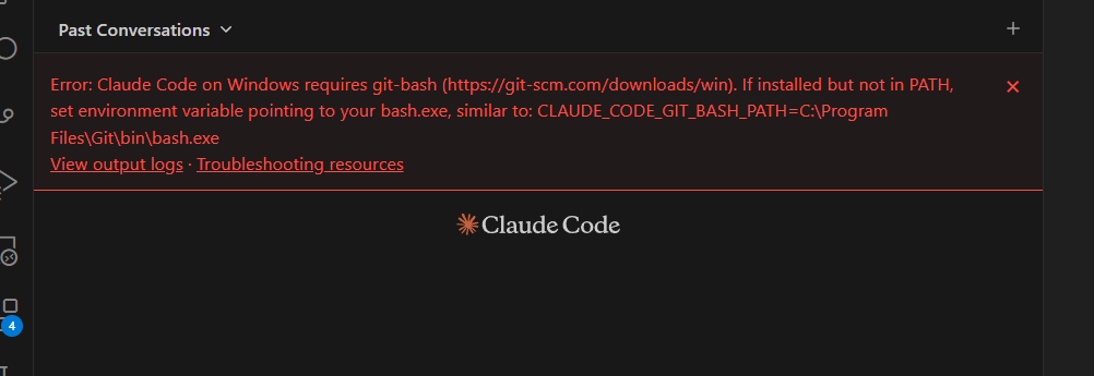 Claude Code on Windows requires git-bash (https://git-scm.com/downloads/win). If installed but not in PATH, set environment variable pointing to your bash.exe, similar to: CLAUDE_CODE_GIT_BASH_PATH=C:\Program Files\Git\bin\bash.exe
