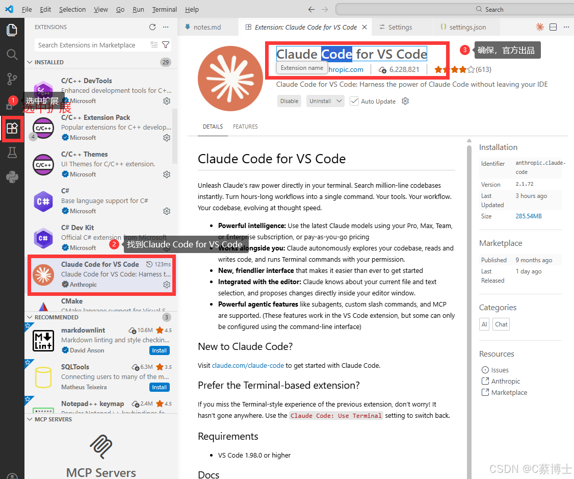 在VS Code插件市场找到Claude Code for VS Code插件(简称Claude Code插件),并点击安装按钮。注意,该插件由anthropic公司发布。