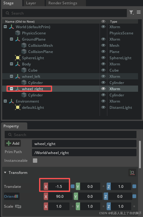wheel_left,右击选择Duplicate(克隆),将克隆出的物体移动到 X = -1.5,同时保持所有其他参数不变;(8)重命名右轮组件