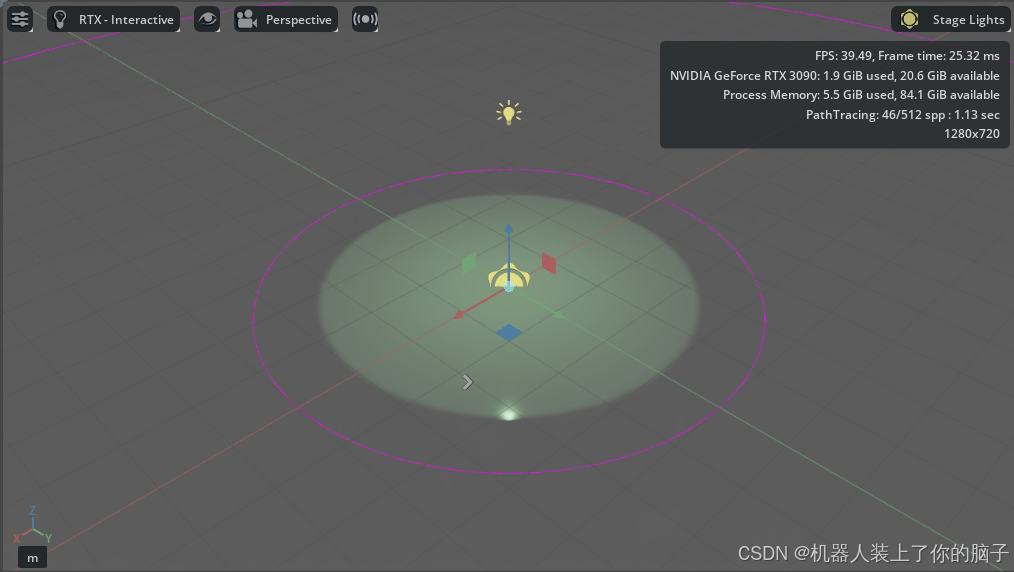 在右上角的Stage 标签页中,从场景树里选中新创建的灯光。在下方的Property(属性)标签页中,找到Transform 部分,使用Translate(位移)工具将其移动到地面上方的位置,例如