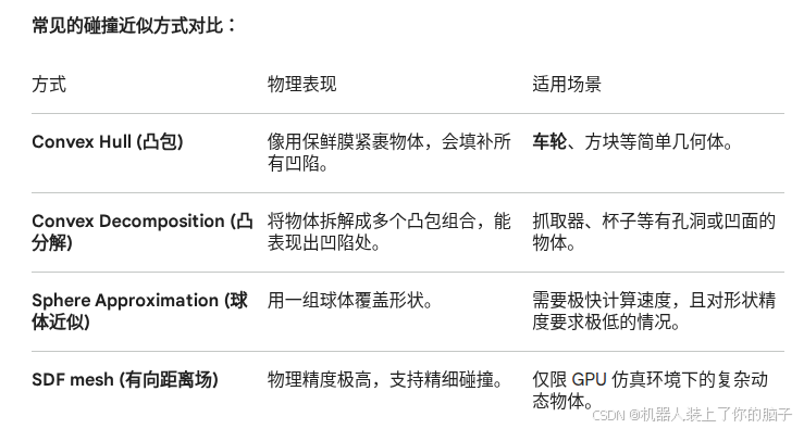 对于动态物体(Dynamic objects),其碰撞形状只能从Convex Hull(凸包)、Convex Decomposition(凸分解)、Sphere Approximation(球体近似)或SDF mesh(仅限GPU后端)中选择。Triangle mesh(三角网格)碰撞形状仅适用于静态物体。