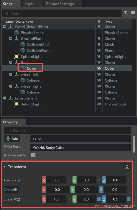 向场景"添加物体"有多种方式,但其本质都是在场景树(Stage Tree)中定义一个USD 原始单元(Primitive)。本教程的目标是创建一个基础的双轮机器人,我们将从创建基础形状并修改其属性开始,使用立方体作为车体,圆柱体作为车块。
