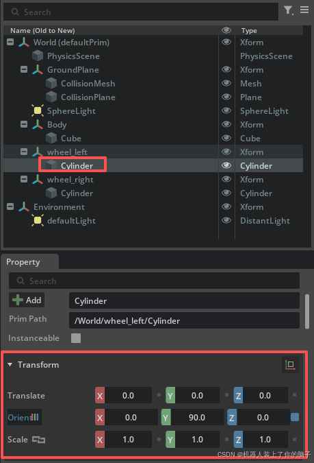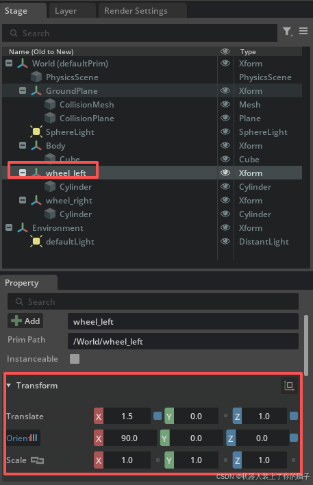 wheel_leftXform节点下,注意轴与圆柱体参数设置;(7)克隆并移动右轮