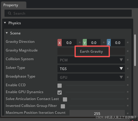 点击该节点以查看其属性。会看到重力被设置为地球重力加速度,即9.8m/s^2。当前的默认长度单位是米(meters)。